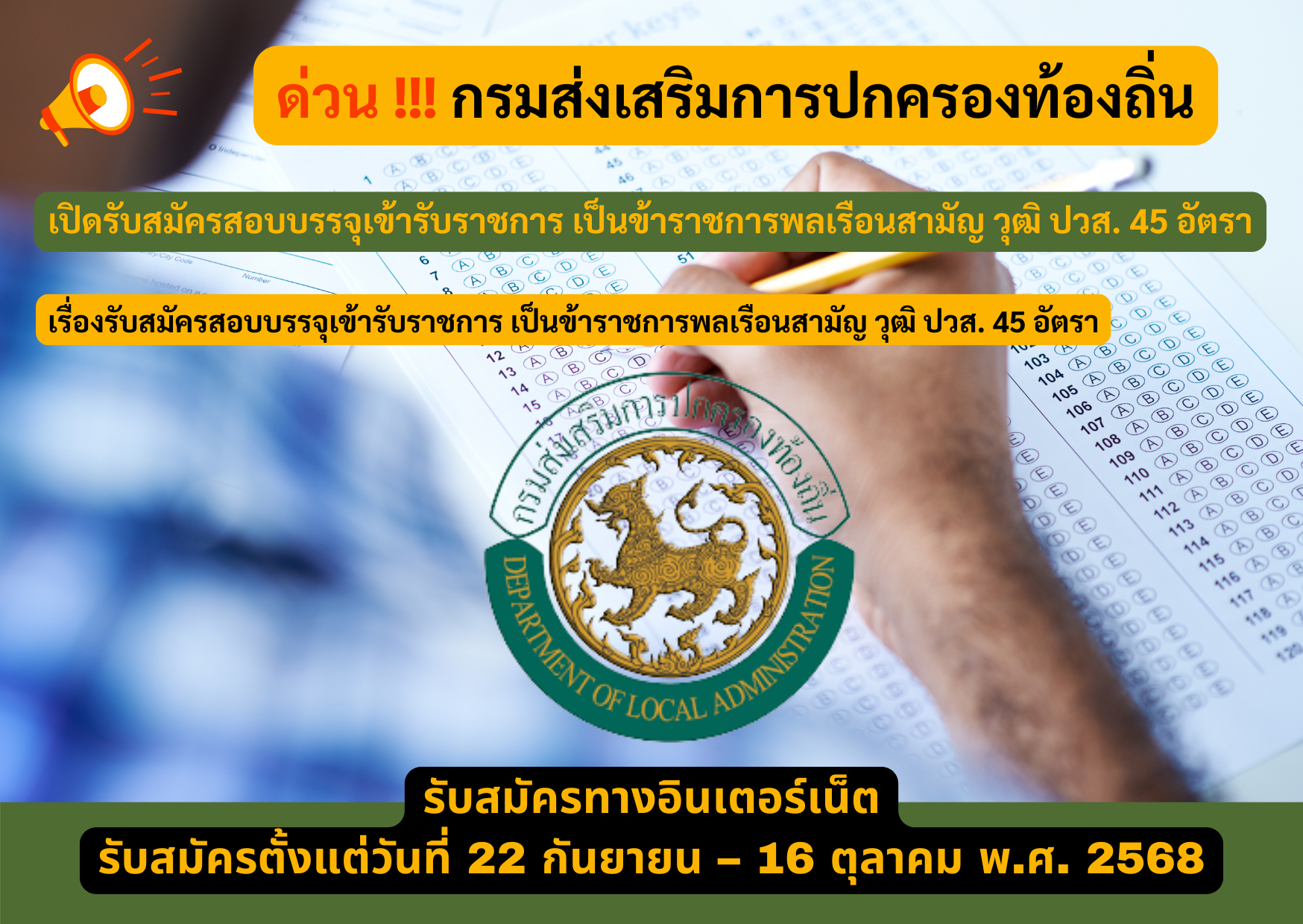 กรมส่งเสริมการปกครองท้องถิ่น รับสมัครสอบบรรจุเข้ารับราชการ เป็นข้าราชการพลเรือนสามัญ วุฒิ ปวส. 45 อัตรา รับสมัคร 22 กันยายน – 16 ตุลาคม 2568
