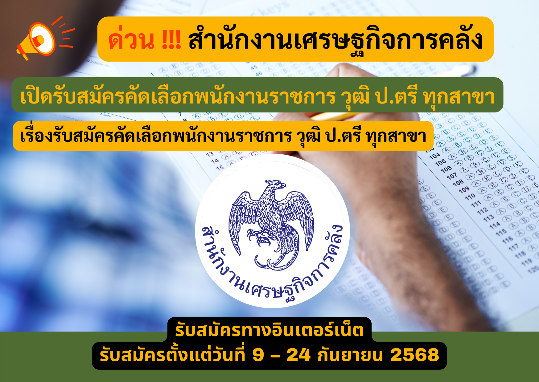 สำนักงานเศรษฐกิจการคลัง รับสมัครคัดเลือกพนักงานราชการ วุฒิ ป.ตรี ทุกสาขา รับสมัคร 9 – 24 กันยายน 2568