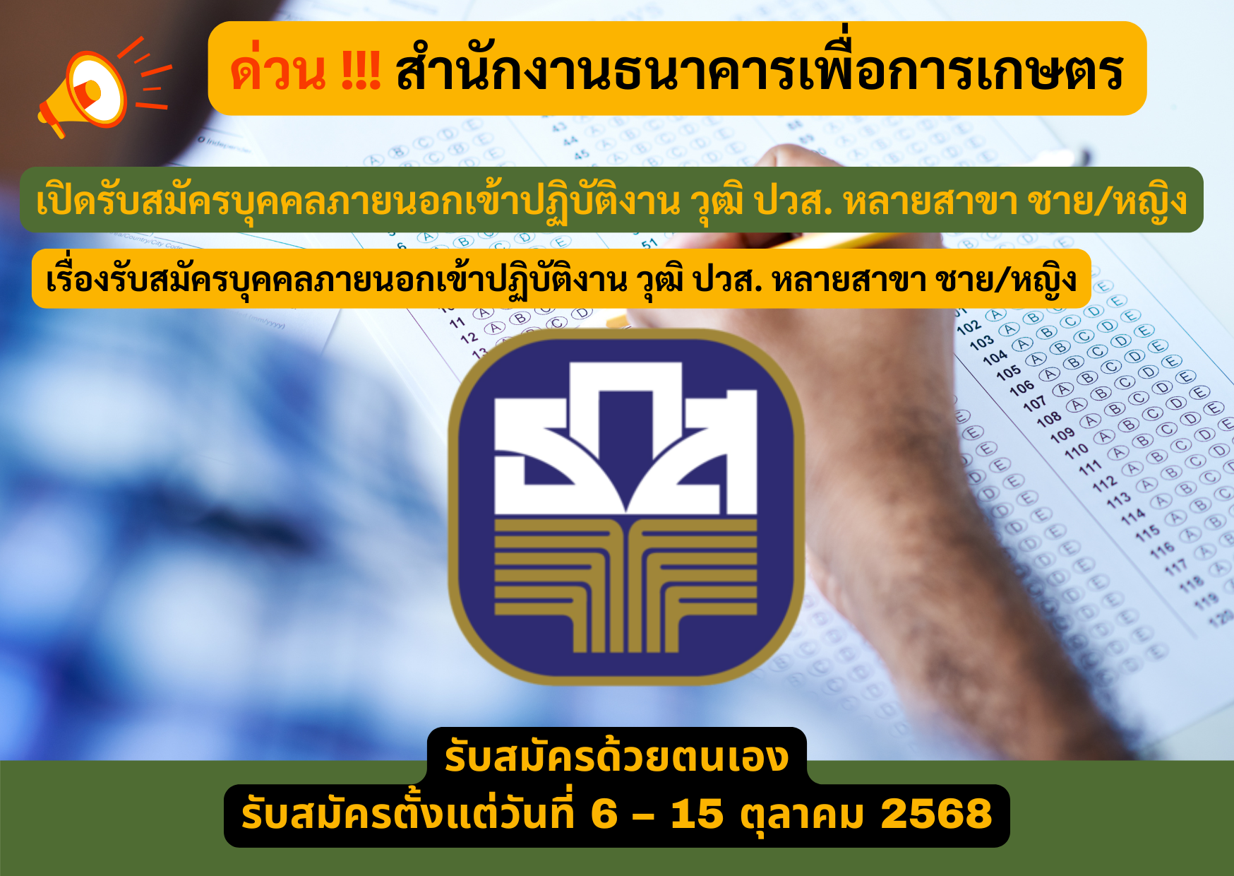 สำนักงานธนาคารเพื่อการเกษตร กรุงเทพมหานคร รับสมัครบุคคลภายนอกเข้าปฏิบัติงาน วุฒิ ปวส. หลายสาขา ชาย/หญิง รับสมัคร 6 – 15 ตุลาคม 2568
