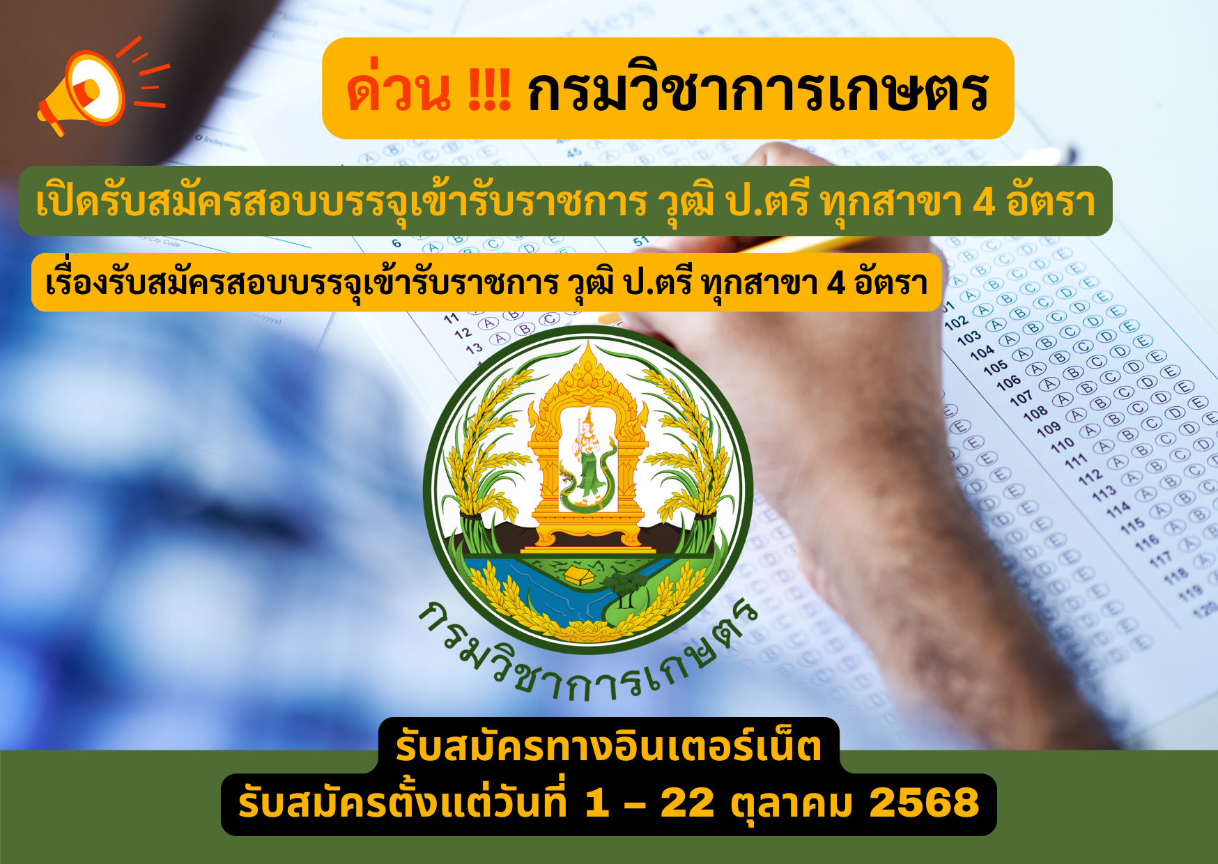 กรมวิชาการเกษตร รับสมัครสอบบรรจุเข้ารับราชการ วุฒิ ป.ตรี ทุกสาขา 4 อัตรา รับสมัคร 1 – 22 ตุลาคม 2568