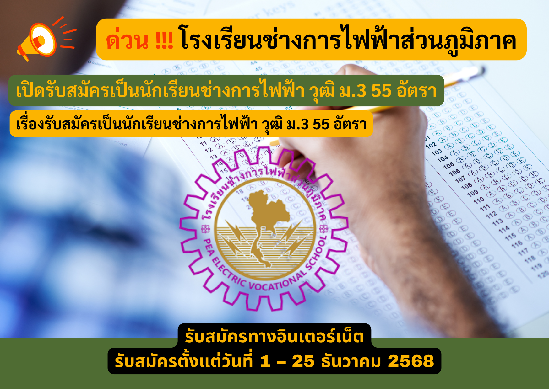 โรงเรียนช่างการไฟฟ้าส่วนภูมิภาค รับสมัครเป็นนักเรียนช่างการไฟฟ้า วุฒิ ม.3 55 อัตรา รับสมัคร 1 – 25 ธันวาคม 2568